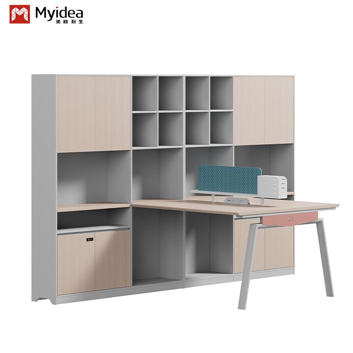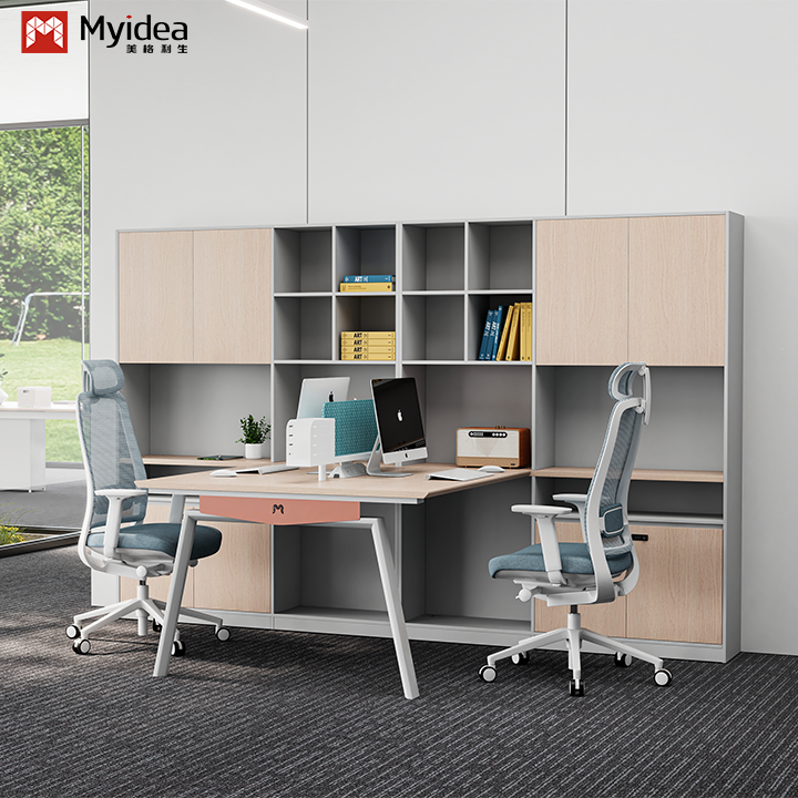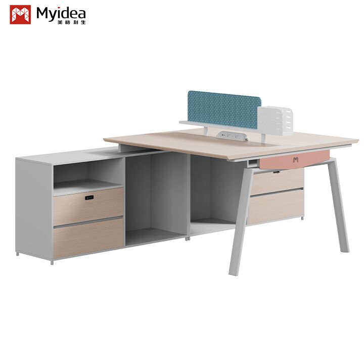 Moderne, umweltfreundliche, aus Holz gefertigte Schreibtisch mit Stoffbildschirm, Stahlfüße, Großschrank, freistehendes Büromöbel